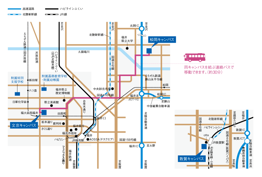 - タクシー/福井駅-(約30分)-福井大学松岡キャンパス[必ず「福井大学松岡キャンパス」と伝えてください]