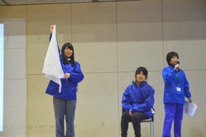 講習会に先立ち、本学の岩井 善郎副学長は、「COC事業として始まったこの講習会も3年目を迎えることができました。今年も実りあるものにできれば」と話しました。今年は、防災サポーターの学生たちが、ストッキングや新聞など身近にあるもので応急手当を行う方法を寸劇で披露し、講習会を盛り上げました。参加者は、本学教員や学生、院生から指導を受け、楽しく講習していました。