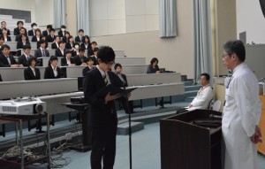 授与式では、山口医学部長が「みなさんは、医師になるための態度、知識、技能を持っていると認定されました。あいさつ、言葉遣い、身だしなみはもちろん、医療人としての心構えを持ち、実習に臨んでください」と激励、中森万緒さんが代表して山口医学部長から認定証を受け取りました。続いて、学生を代表して岩田憲吾さんが、「患者さんに真心を持って接することを誓います」と宣誓しました。