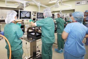 手術室で最新の医療機器に囲まれた生徒たちは緊張しながらも、現場で活躍している医師の指導を受け真剣に取り組みました。また、医師や看護師と懇談する場もあり、医療現場の話や医師としてのやりがいなどについて語り合いました。
