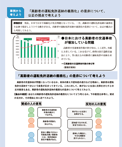 2019年4月、東京・池袋で高齢ドライバーによる大事故がありました。このような事故が起こるたび、認知、身体能力が衰える高齢者は運転免許の返納を義務化すべし、という論議が持ち上がります。でも、運転できなければたちまち日常生活に困る高齢者もいます。この主張に賛成、反対双方の立場から討論(ディベート)の基礎となる教材を学生らと考え、新しい高校教科書の内容に発展させられないか検討しています。皆さんの考えはどっちですか?