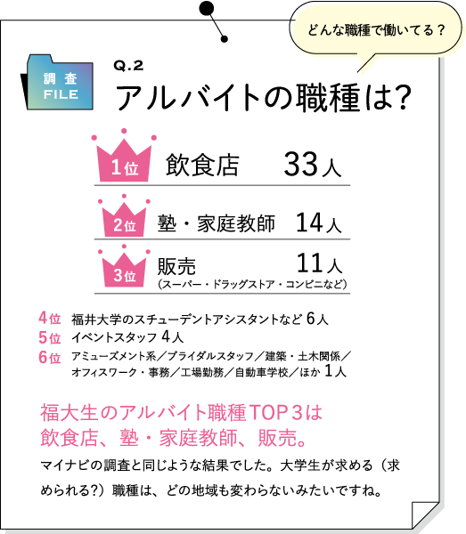 そこで私たちは福大生のアルバイト事情を調査すべく、人気の職種や面白エピソード、目的などアンケートで探ってみました。