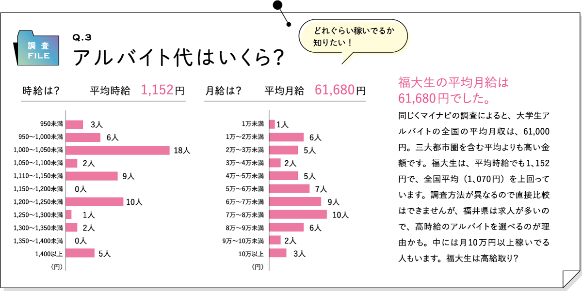 同じくマイナビの調査によると、大学生アルバイトの全国の平均月収は、61,000円。三大都市圏を含む平均よりも高い金額です。福大生は、平均時給でも1、152円で、全国平均(1、070円)を上回っています。調査方法が異なるので直接比較はできませんが、福井県は求人が多いので、高時給のアルバイトを選べるのが理由かも。中には月10万円以上稼いでる人もいます。福大生は高給取り?