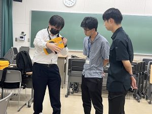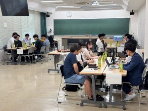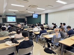 冒頭の、本学工学部の坂元博昭准教授による入門講座では、CNの基本的な考え方として、二酸化炭素などの温室効果ガスの排出と吸収のバランスの重要性が解説されました。また、CNへの取組が企業の信頼や競争力に関わる重要な経営課題となっていることも紹介され、学生たちは熱心に聴講していました。