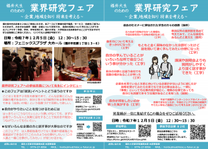 産学官連携本部では、学生のみなさんが就職活動に至る前に、個性や適性に応じた職業を選択したり、必要な能力を身につけたりするために自身の将来やキャリア形成を考えるきっかけとすることを目的に「福井大生のための業界研究フェア」を実施します。