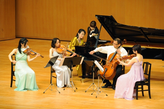 パーティーの後は、場所を福井市文化会館に変え、新入生歓迎コンサートを鑑賞。「最初に最高の音楽を」というテーマで開催されたこのコンサートは、本学のイメージミュージックを作曲した笠松泰洋氏がプロデュース。笠松氏は東京を起点に活躍している作曲家で福井県出身でもあることから、例年本学と協同し卒業記念前夜祭などのクラシックコンサートを実施してきました。今回は、国内で唯一常設の弦楽四重奏楽団 クァルテット・エクセルシオ、国内外で活躍されているピアニスト 大宅さおり氏ら一流のアーティストが、クラシック演奏を披露しました。エネルギッシュなパーティーを終えた新入生らは、真剣な表情で聞き入り、「このようなクラッシックの音楽会は初めて。また機会があれば聞いてみたい。」と満足そうに話していました。
