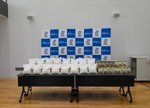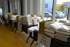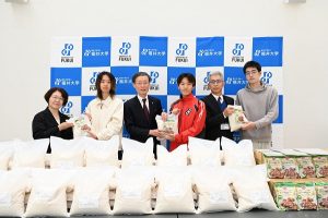 物価高騰で困窮する学生を支援するため、本学は日本学生支援機構の助成金および福井大学基金への寄附金を活用し、11月14日に食料品の贈呈式を行いました。今回の支援は、学生の経済的負担を軽減し、安心して学業に専念できる環境を整えることを目的としたもので、福井県産新米「いちほまれ」3kgとCOOPビーフカレー500人分を贈呈しました。