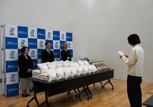 贈呈式で、内木宏延学長は「福井の美味しいお米を食べて、心と体の栄養にしてほしい。食事をしっかりとり、福井大学での学びに励んでほしい」と激励の言葉を述べました。代表で挨拶をした学生は「福井の美味しい食材に触れることができることはとても楽しみであり、本日いただいた温かいご支援を力に変えて、これまで以上に学業や研究に専念していきたい」と感謝の気持ちを述べました。