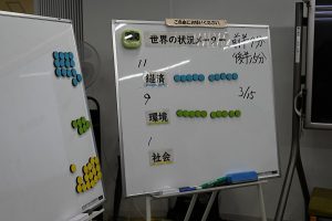同ゲームの公認ファシリテーターである教育学部の守田弘道准教授が進行役を務め、学生、職員合わせて15名が参加。カードゲームを通じてSDGsの目標を達成するまでの道のりを体験しました。参加者は限られたお金と時間を使ってプロジェクトを実行します。その一つひとつのプロジェクトが、世界の経済・環境・社会に影響を与えることを体感しながら、他のプレイヤーと協力し、個人の目標達成や持続可能な世界の実現を目指します。