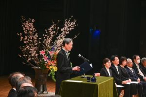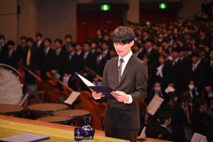 新入生を代表して、医学部医学科の小嶋蒼士さんが「学生としての自覚のもとに学則及び諸規則を遵守し学業に励み、品性を正し、学生の本分を全うすることを誓います」と宣誓。続いて内木宏延学長が「自分なりの『問い』を見つけ、それに対する『答え』を考えてみてほしい。一つひとつの問いに向き合う経験が、皆さん自身の未来を切り拓く大きな一歩になるはず」と新入生へ温かなエールを送りました。