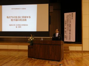 はじめに、山口 治太郎 美浜町長から挨拶があり、本学の事務局から活動経過報告がありました。その後、「私たちの生活に貢献する電子線の利活用」と題し、大学院工学研究科ファイバーアメニティー工学専攻の堀 照夫 教授が講演しました。会場には、地域住民約200名の参加があり、本学との連携への関心の高さがうかがわれました。