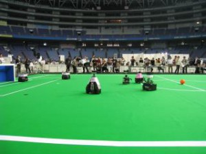 FC-Soromonsは、5年前から出場しており、2年前から阪大と合同チームを組み、一昨年、昨年と4位にとどまっていましたが、今年はようやく悲願の入賞を果たしました。 ロボカップサッカーは、人間のサッカー試合と同じく、競技会形式で行われ、自律移動型ロボットを使います。本学からは、学生9名・教員1名の10名が参戦しました。