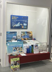 「海の豊かさを、誰が守る?」というテーマのもと、海を守るための多様な視点を紹介しています。 ワカメなどの藻類がCO2を吸収する「ブルーカーボン」の仕組みの解説や日焼け止めとサンゴ礁保全の関係を伝える「リーフセーフ」の考え方などを学ぶことができます。 さらに、海洋プラスチック問題に取り組む「Cap to Future」プロジェクトの紹介では、本学の学生と県内企業が連携し、集めたペットボトルキャップをボールペンなどにアップサイクルする(価値を高めて生まれ変わらせる)プロセスを、実物と共に展示しています。
