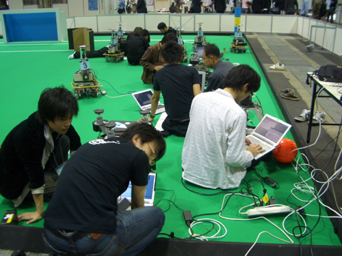 最後にチーム責任者としてのお願いです。大学も予算削減の時代ですが、1研究室での大きなロボット競技会への参戦は非常に厳しく、実用的な研究に比べスポンサーを集めるのも極めて困難なものがあります。このような学生の積極的な教育研究活動に対して賛同してくださるスポンサーがおられましたら、是非ご一報ください。また、我々のチームFC-Soromons(チーム公式サイト)に興味をもった学生さんがおられましたら、いつでも遠慮なく研究室に遊びに来てください。お待ちしております!