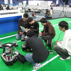 2007年からは大阪大学と合同チームを結成することになり、今年で3年目でしたが、福井と大阪という離れた場所のため合同練習を行うことがなかなかできず、特にチームサーバ(ロボットに指令を送るPC)の調整や総合練習などは直接会って行わなければならないため、日程調整など苦労する部分も多くありました。しかしながら、合同チームを結成することにより、相手チームから我々の抱えている問題のアドバイスを頂けたことや、情報の共有ができたことなど、得るものはとても多かったように思います。また、同じ目標を目指して戦ってきたので、入賞したときの喜びはとても大きいものがありました。